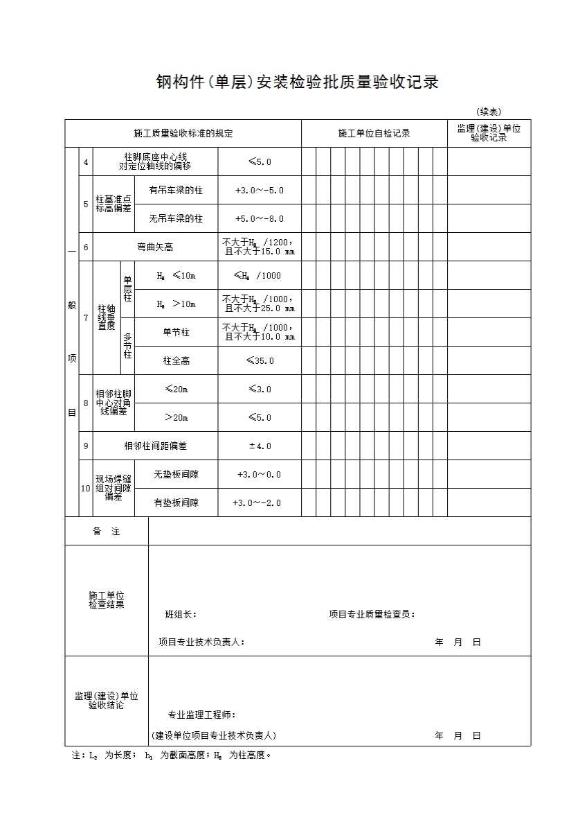 表格名称:钢构件(单层)安装检验批质量验收记录