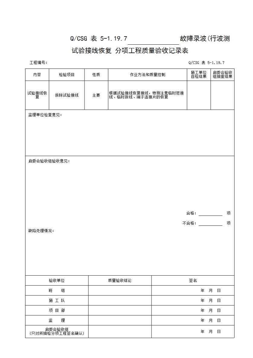 表格名称:QCSG 表 5-1.19.7 ______故障录波(行波测距)试验接线恢复 分项工程质量验收记录表