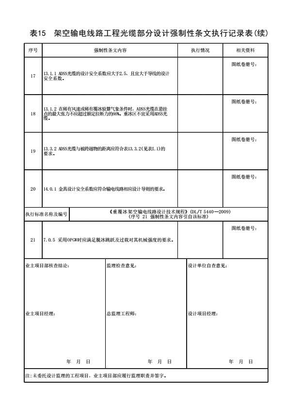 表格名称:表15 架空输电线路工程光缆部分设计强制性条文执行记录表