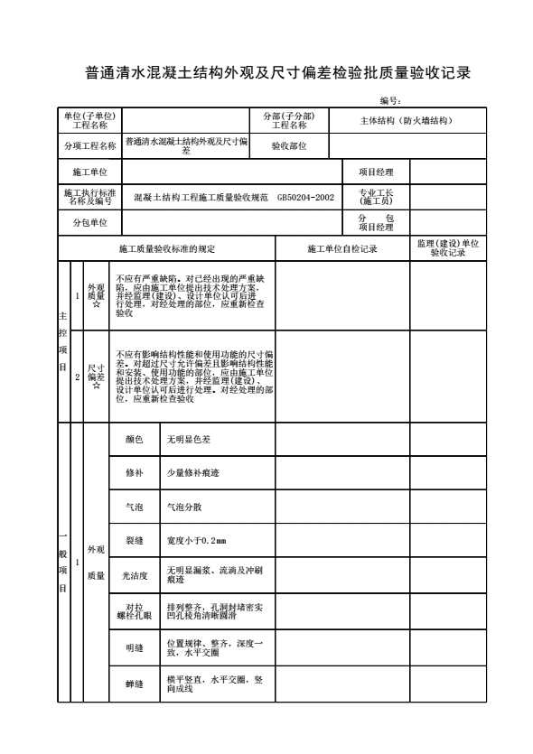 表格名称:普通清水混凝土结构外观及尺寸偏差检验批质量验收记录