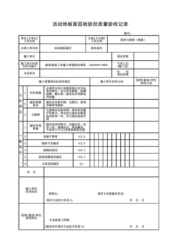 表格名称:活动地板面层检验批质量验收记录