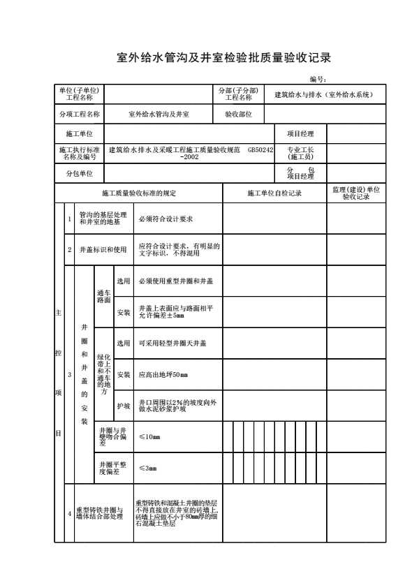 室外给水管沟及井室检验批质量验收记录