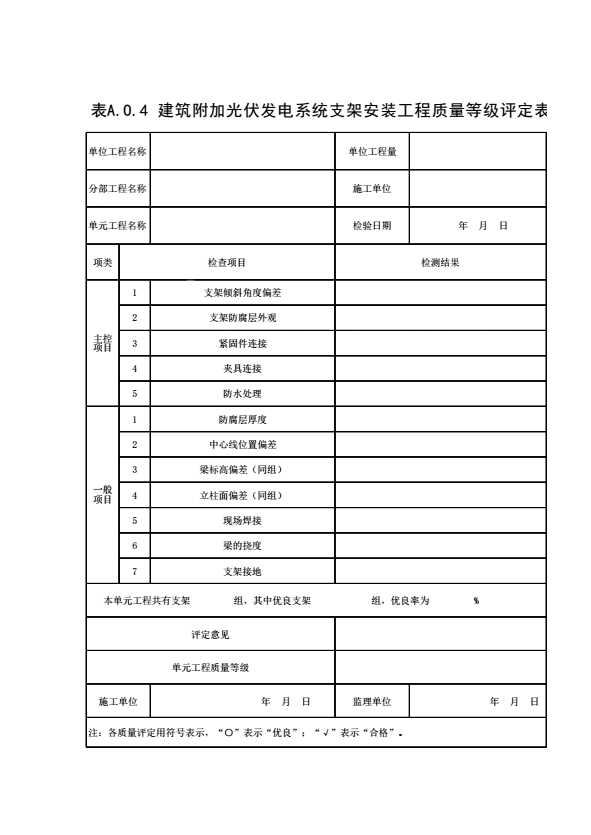 表格名称:表A.0.4 建筑附加光伏发电系统支架安装工程质量等级评定表