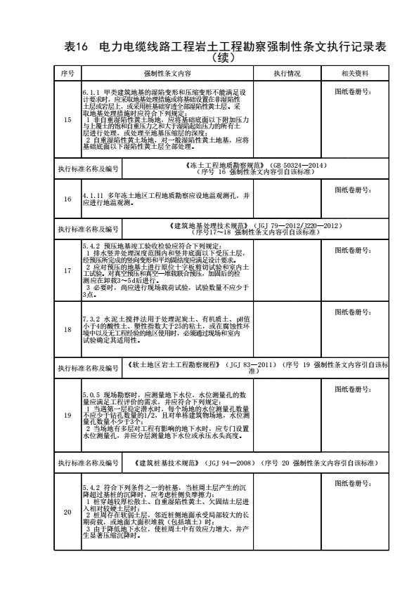 表16 电力电缆线路工程岩土工程勘察强制性条文执行记录表