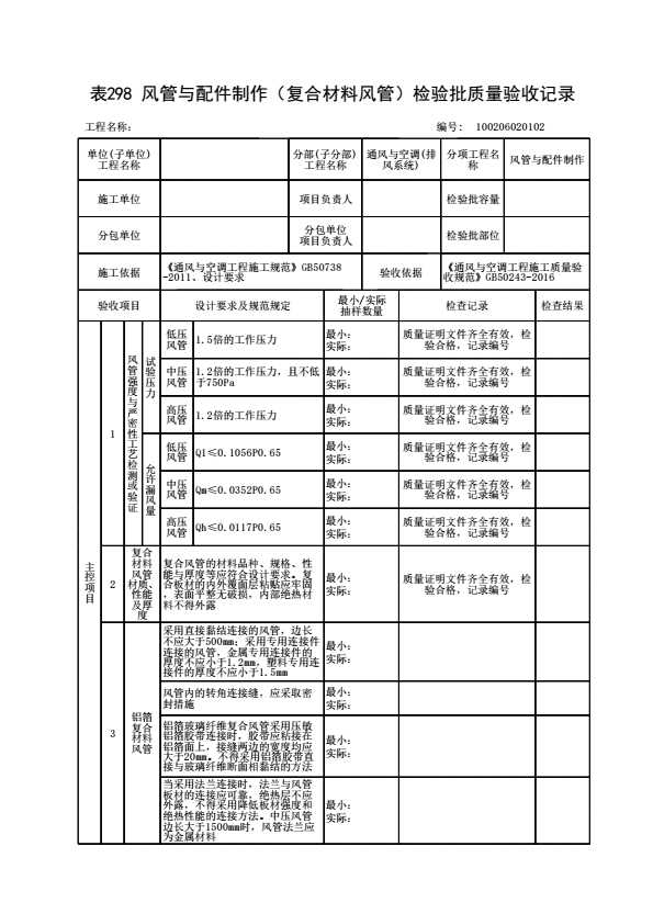 表格名称:100206020102 风管与配件制作(复合材料风管)检验批质量验收记录