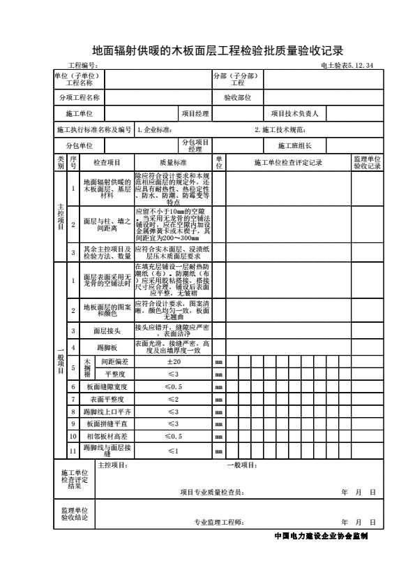 表格名称:电土验表5.12.34 地面辐射供暖的木板面层工程检验批质量验收记录