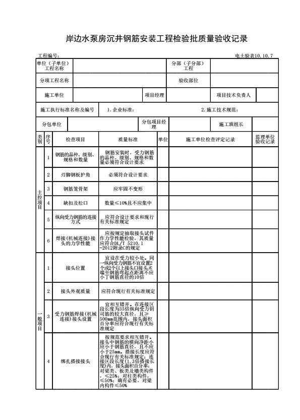 表格名称:电土验表10.10.7 岸边水泵房沉井钢筋安装工程检验批质量验收记录