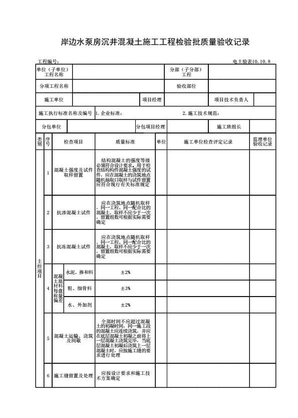 表格名称:电土验表10.10.8 岸边水泵房沉井混凝土施工工程检验批质量验收记录