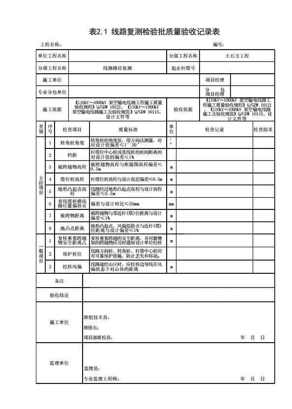 表格名称:表2.1 线路路径复测检验批质量验收记录表