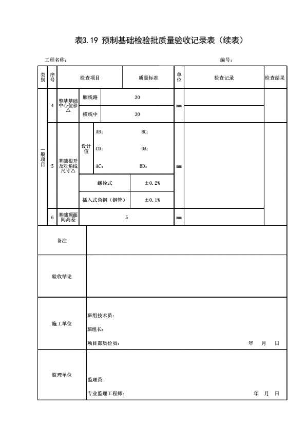 表格名称:表3.19 预制基础检验批质量验收记录表