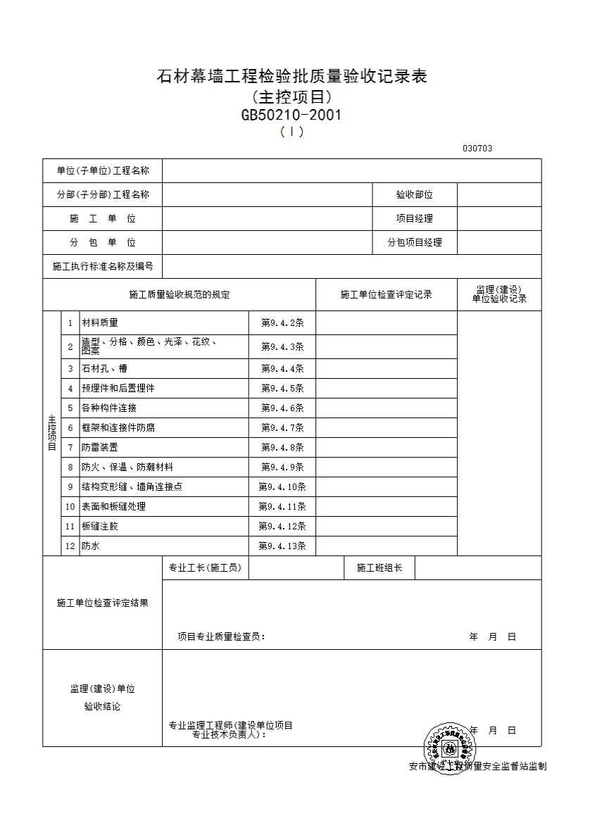 表格名称:石材幕墙工程检验批质量验收记录表(Ⅰ)