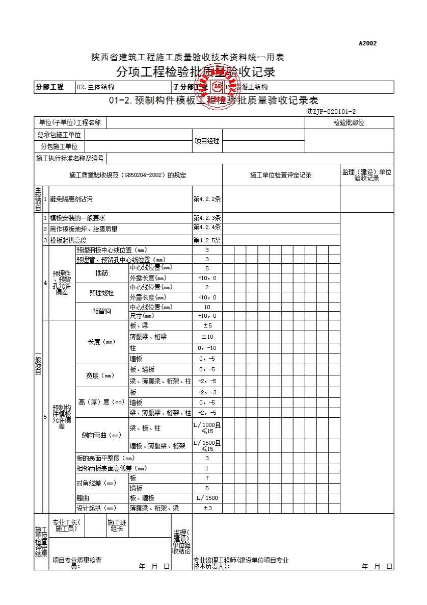 表格名称:A2002 预制构件模板工程检验批质量验收记录