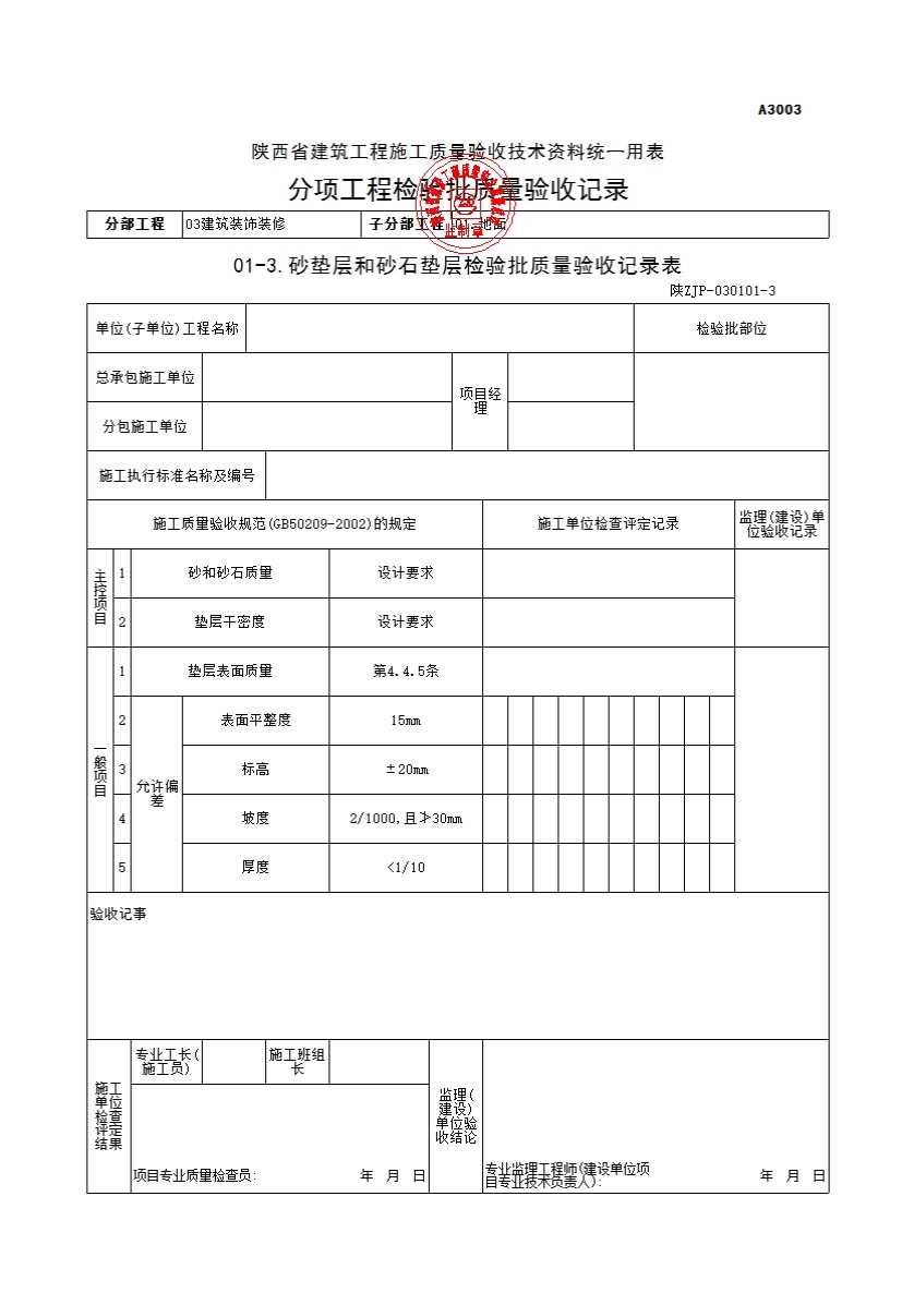 A3003 砂垫层和砂石垫层检验批质量验收记录表