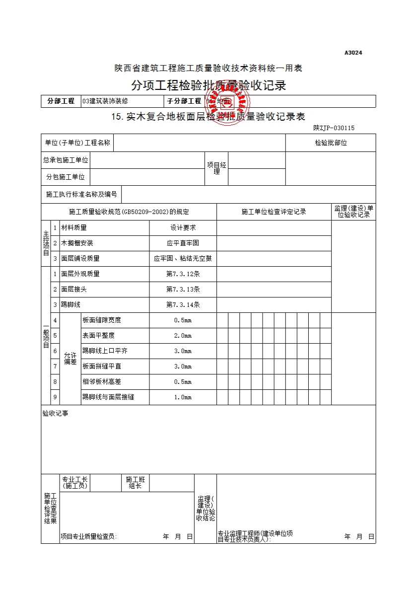 表格名称:A3024 实木复合地板面层检验批质量验收记录表