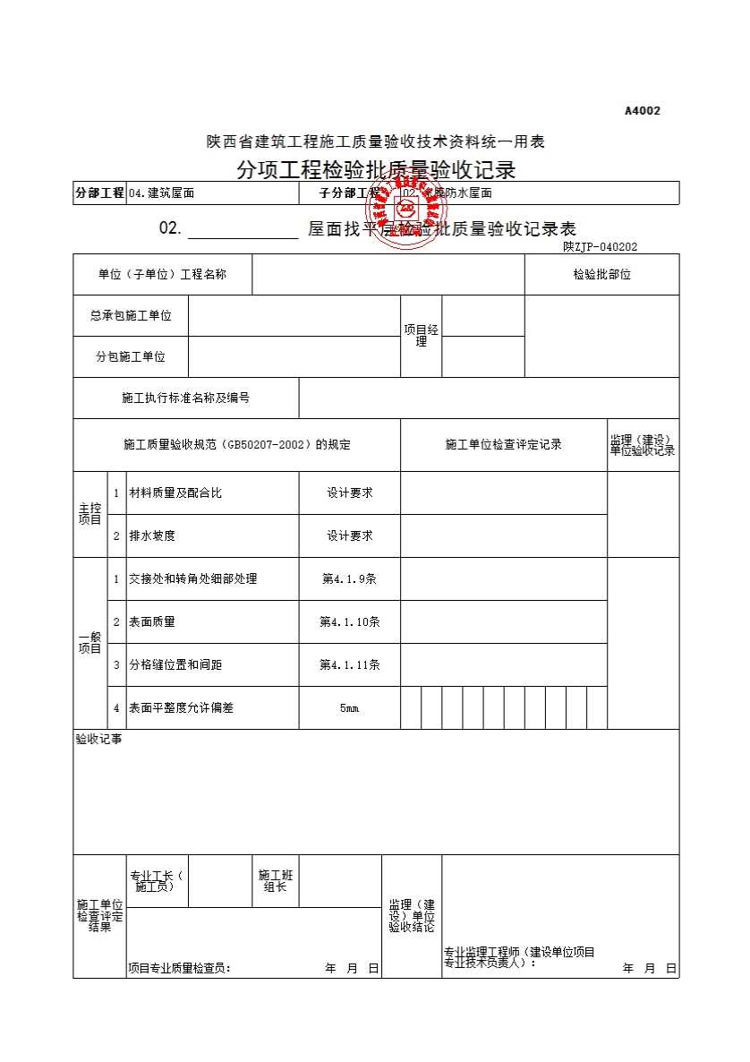 表格名称:A4002 ____屋面找平层检验批质量验收记录表