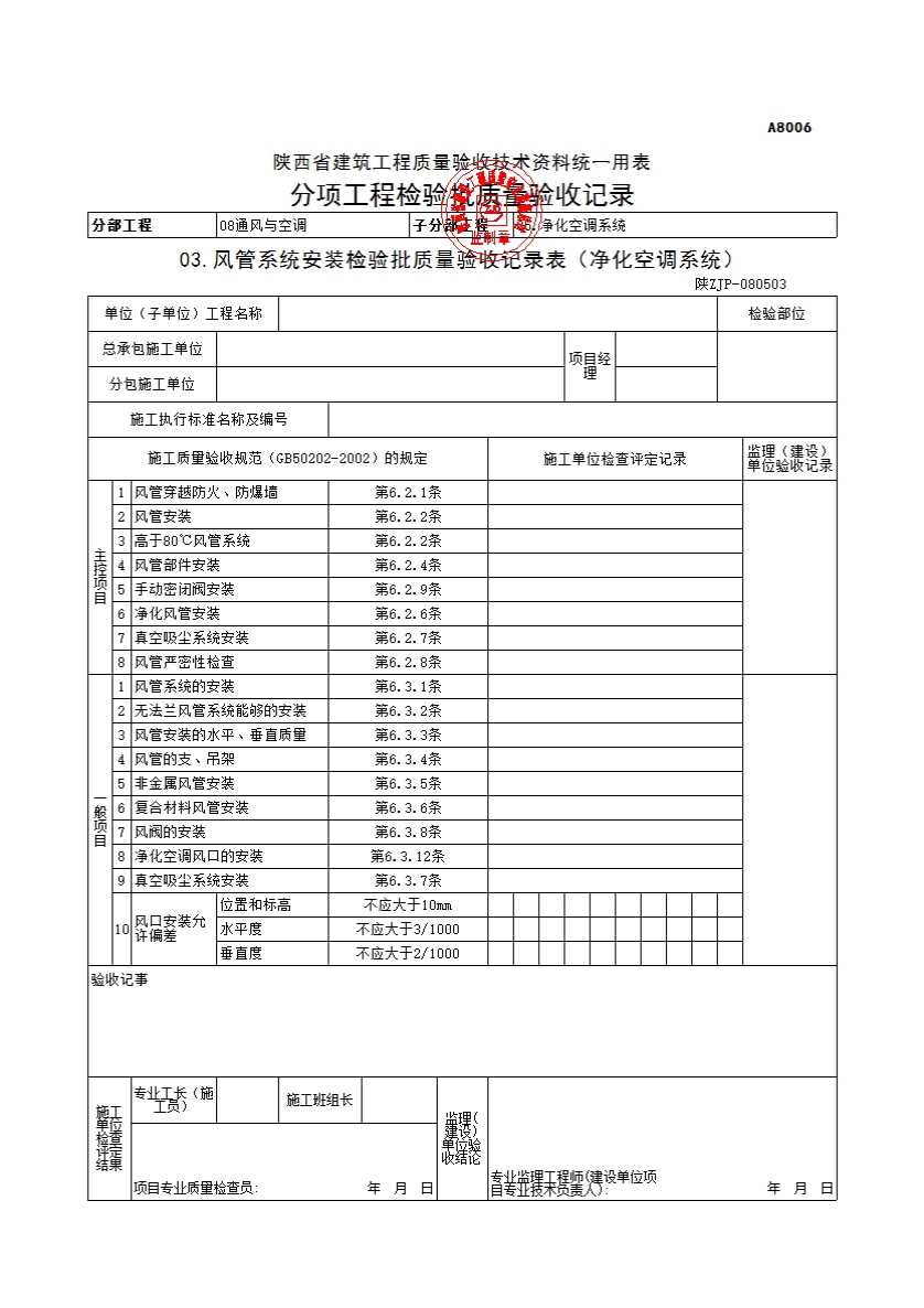 表格名称:A8006 风管系统安装检验批质量验收记录表(净化空调系统)