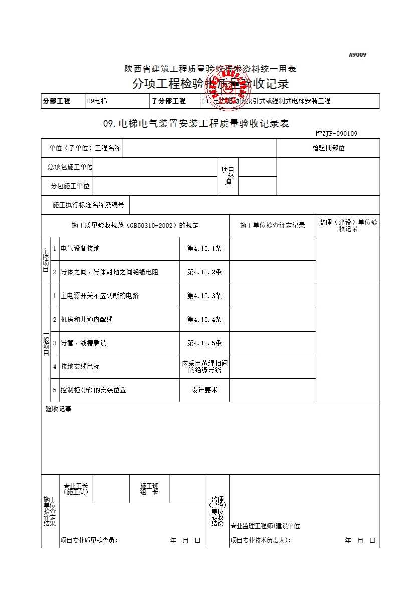 表格名称:A9009 电梯电气装置安装工程质量验收记录表