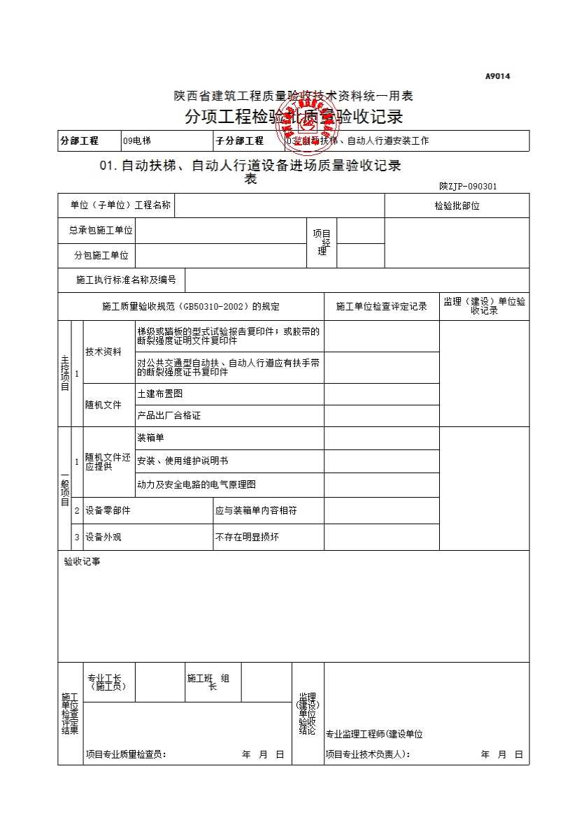 表格名称:A9014 自动扶梯、自动入行道设备进场质量验收记录表