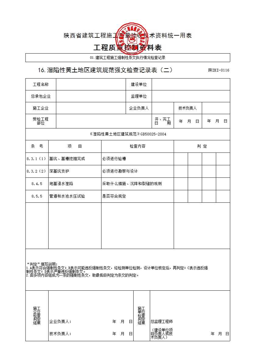 表格名称:陕ZKZ-0116 湿陷性黄土地区建筑规范强文检查记录表(二)C1016-04