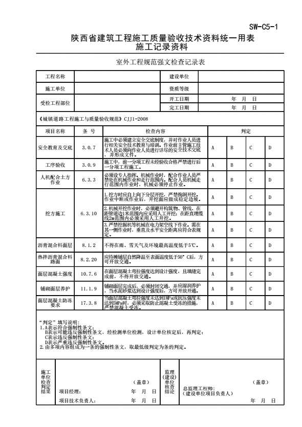 表格名称:SW-C5-1 室外工程规范强文检查记录表
