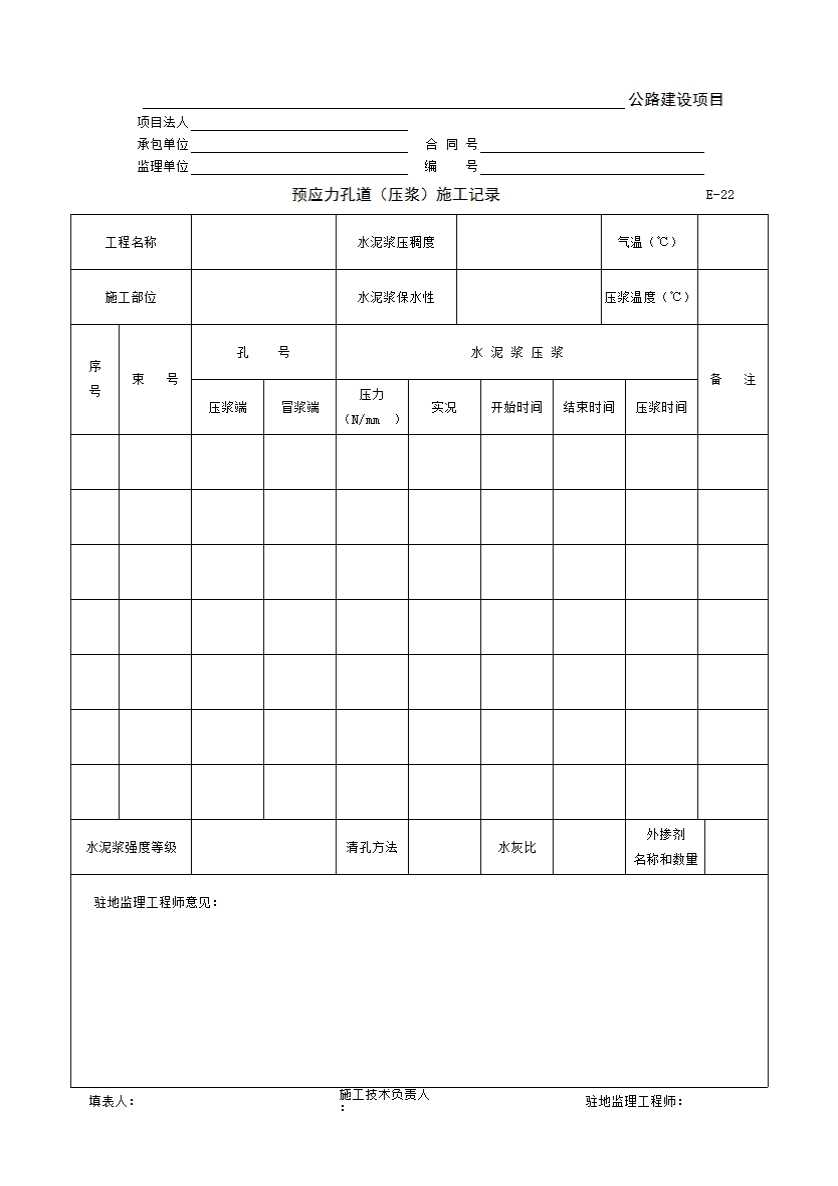表格名称:E-22 预应力孔道(压浆)施工记录
