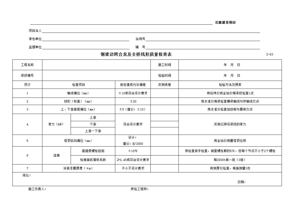 I-83钢梁边跨合龙及全桥线形质量检查表