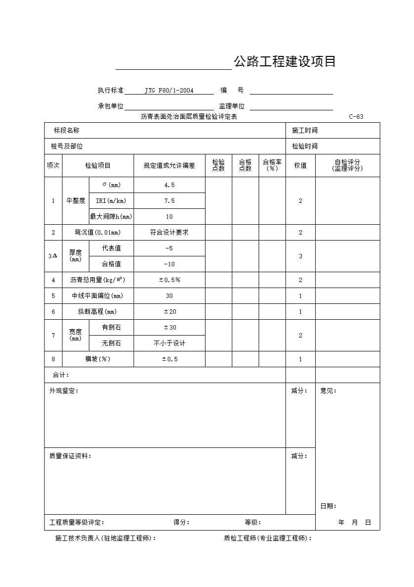 表格名称:C-63表 沥青表面处治面层质量检验评定表