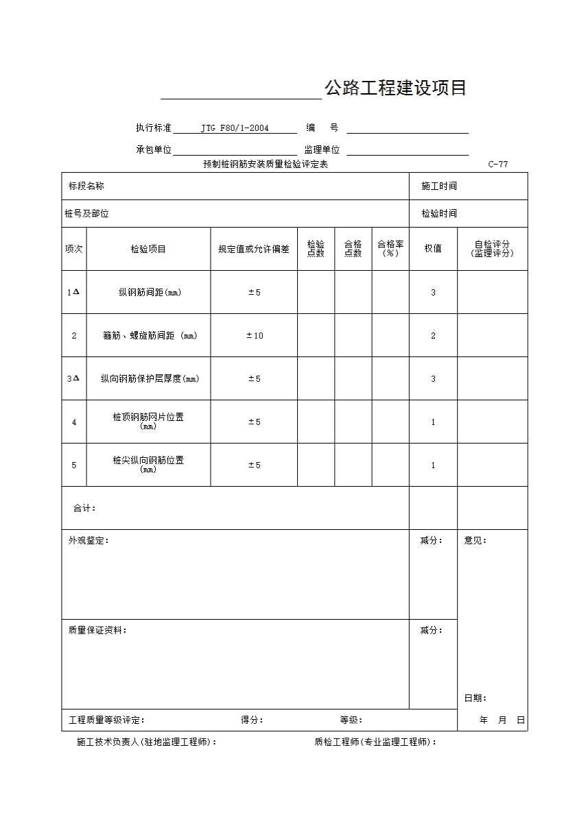 C-77表 预制桩钢筋安装质量检验评定表