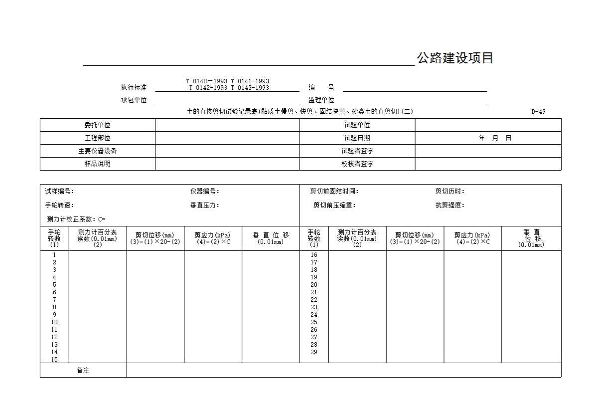 D-49 土的直接剪切试验记录表(黏质土慢剪、快剪、固结快剪、砂类土的直剪切)(二)