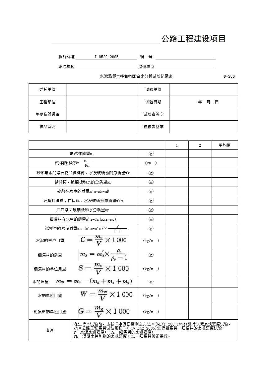 表格名称:D-206 水泥混凝土拌和物配合比分析试验记录表