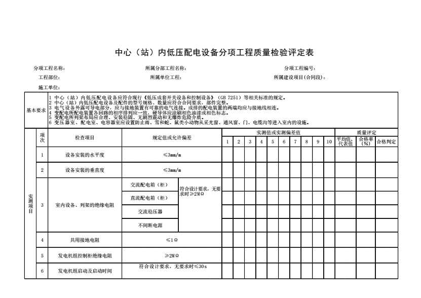 表格名称:表9.20.2 中心(站)内低压配电设备分项工程质量检验评定表