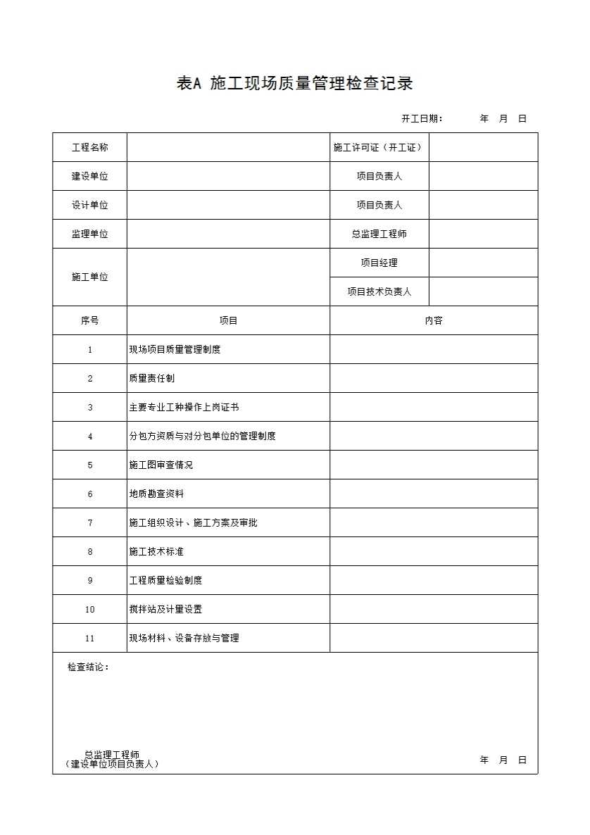 表格名称:表A___施工现场质量管理检查记录