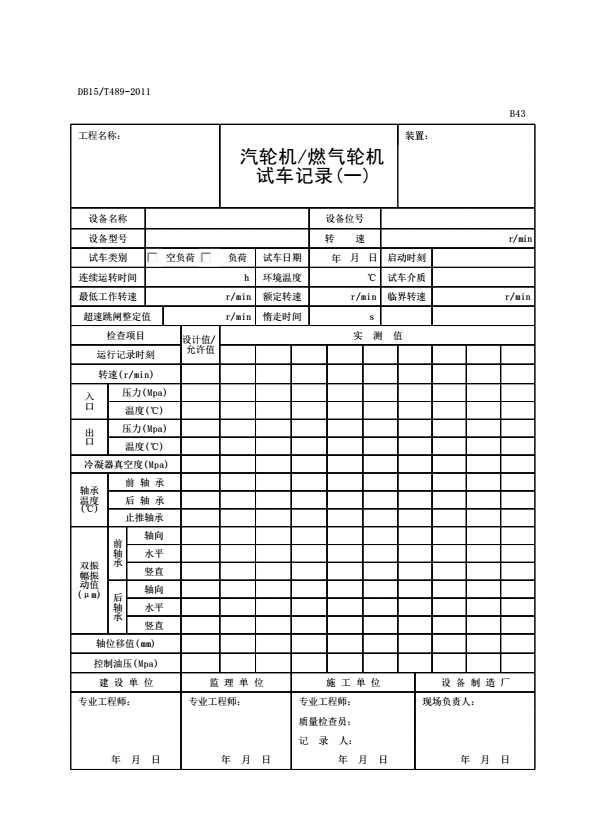 表格名称:B43 汽轮机/燃气轮机试车记录(一)