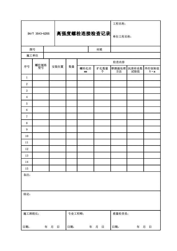 SH/T 3543-G205 高强度螺栓连接检查记录