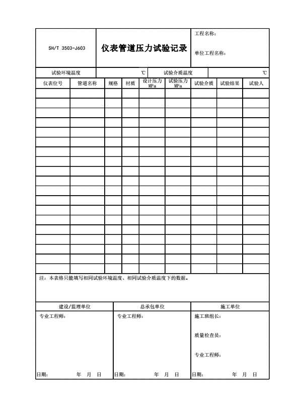 表格名称:SH/T 3503-J603 仪表管道压力试验记录
