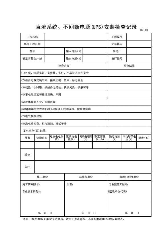 表格名称:DQ-13 直流系统、不间断电源(UPS)安装检查记录
