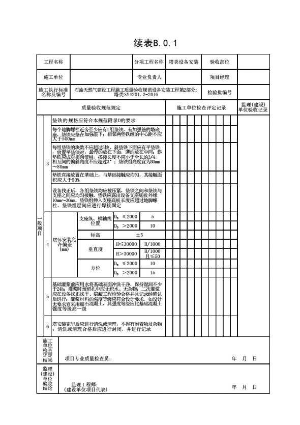 表格名称:表B.0.1 塔体安装检验批质量验收记录