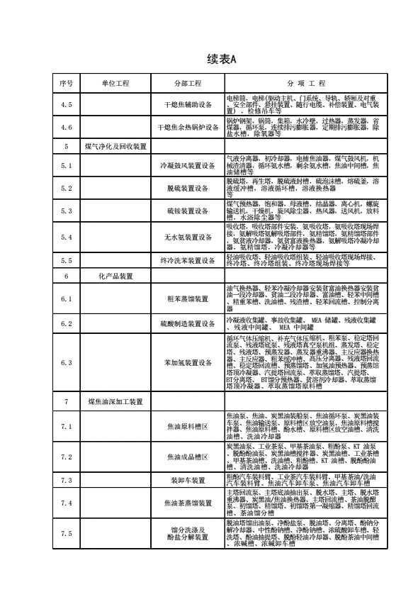 表格名称:附录A 焦化机械设备安装分部分项划分表