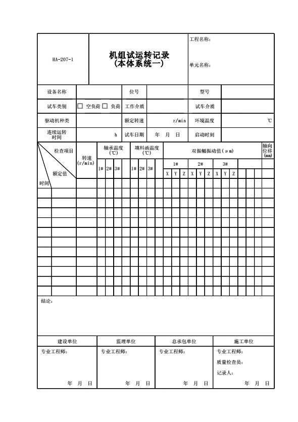表格名称:HA-207-1 机组试运转记录(本体系统一)