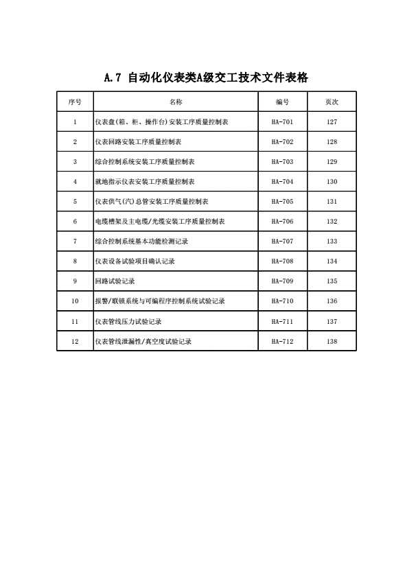 表格名称:A.7 自动化仪表类A级交工技术文件表格