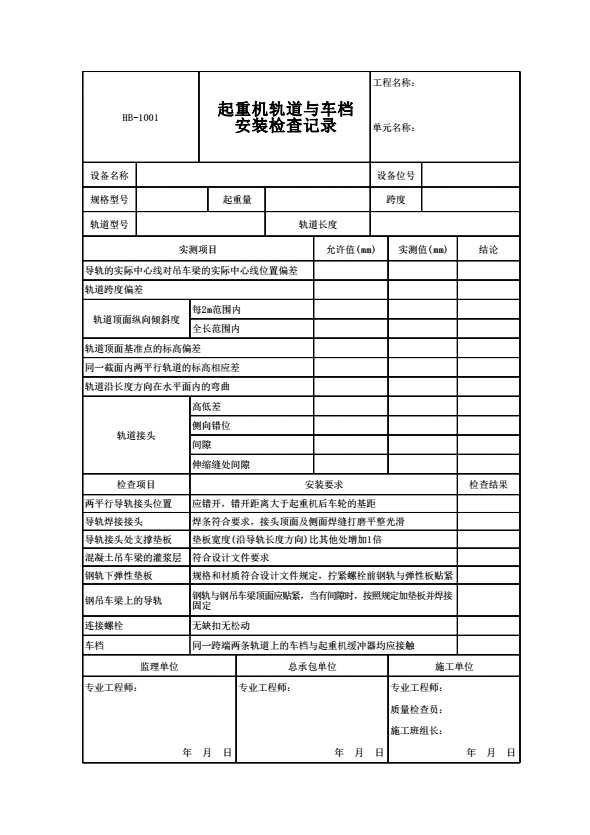 表格名称:HB-1001 起重机轨道与车档安装检查记录