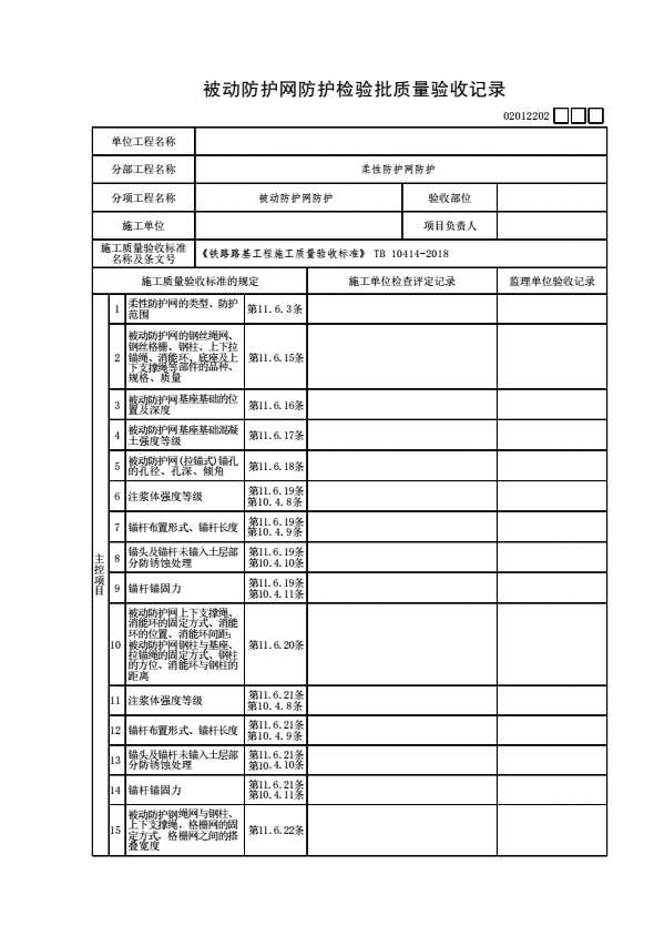 表格名称:02012202 被动防护网防护检验批质量验收记录