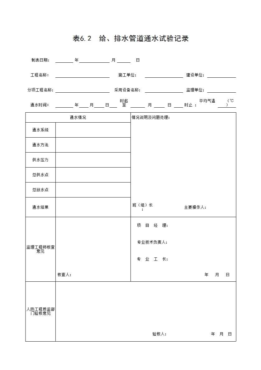 表格名称:表6.2 给、排水管道通水试验记录