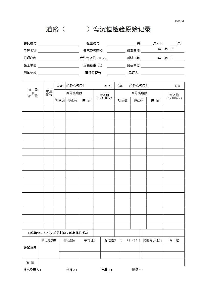 表格名称:F34-2 道路弯沉值检验记录(路基、基层)