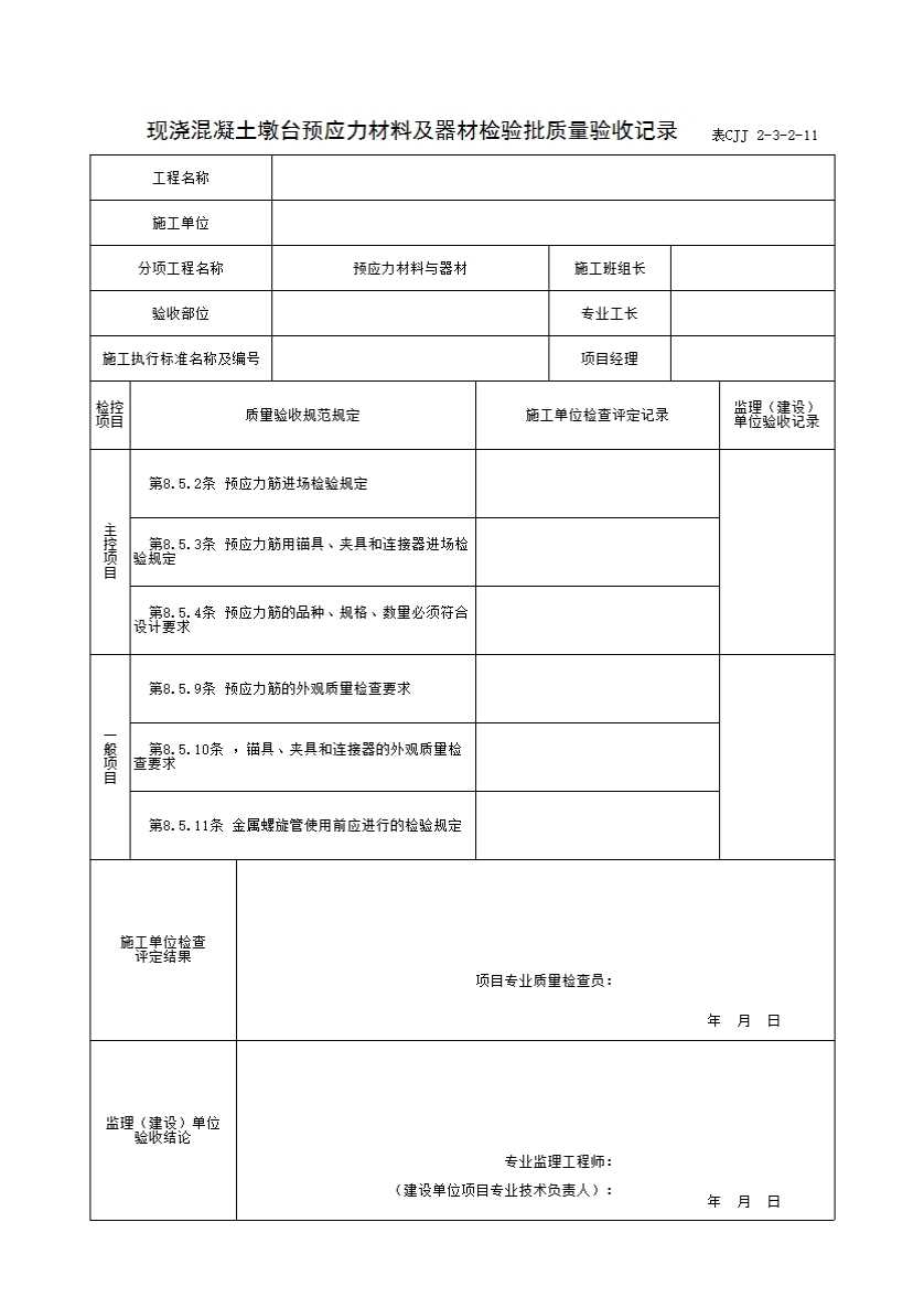 表CJJ2-3-2-11 现浇混凝土墩台预应力材料及器材检验批质量验收记录