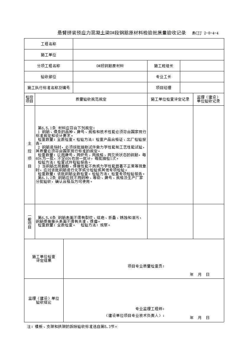 表格名称:表CJJ 2-8-4-4 悬臂拼装预应力混凝土梁0#段钢筋原材料检验批质量验收记录