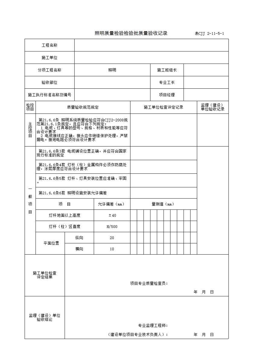 表CJJ 2-11-5-1 照明质量检验检验批质量验收记录