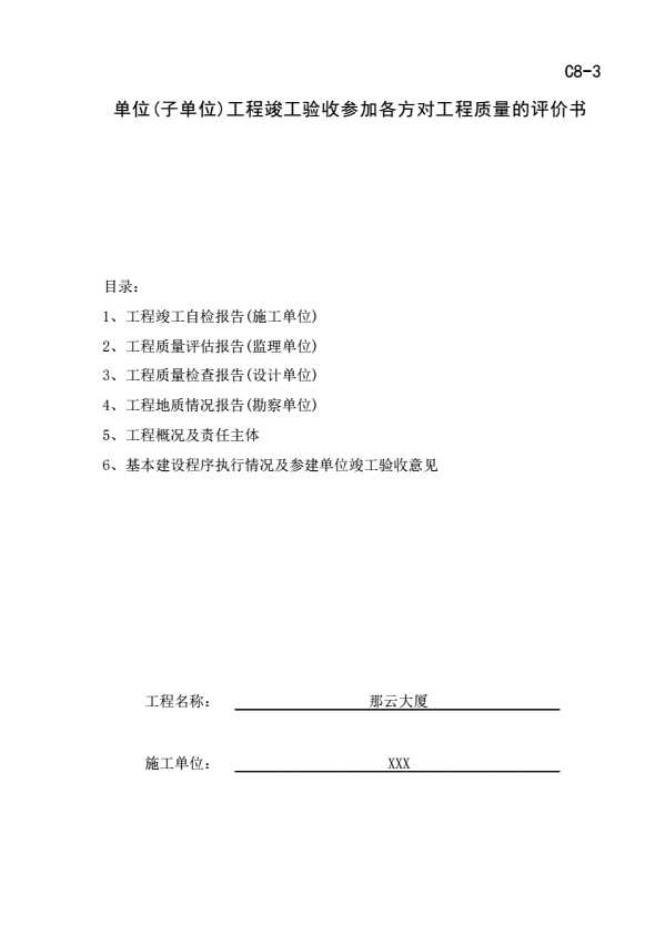 C8-3 单位(子单位)工程竣工验收参加各方对工程质量的评价书