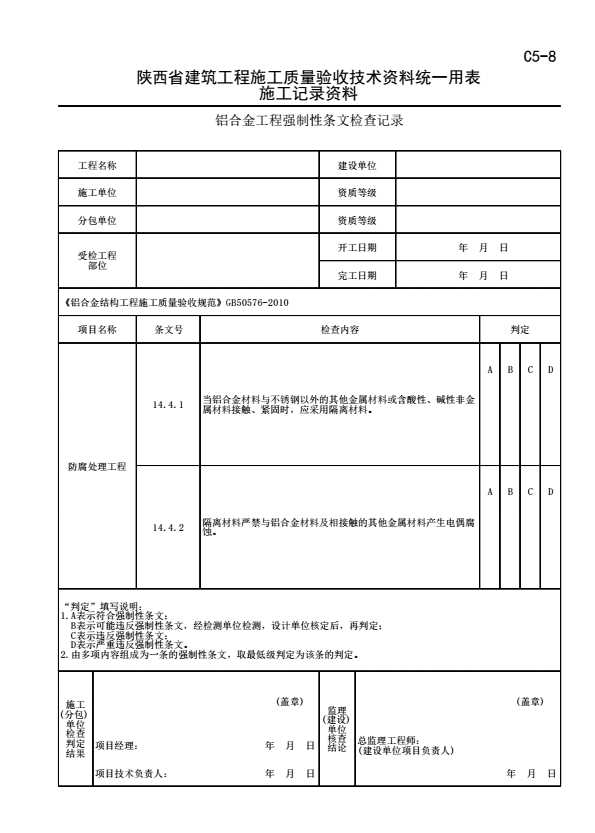 表格名称:C5-8 铝合金结构工程强制性条文检查记录
