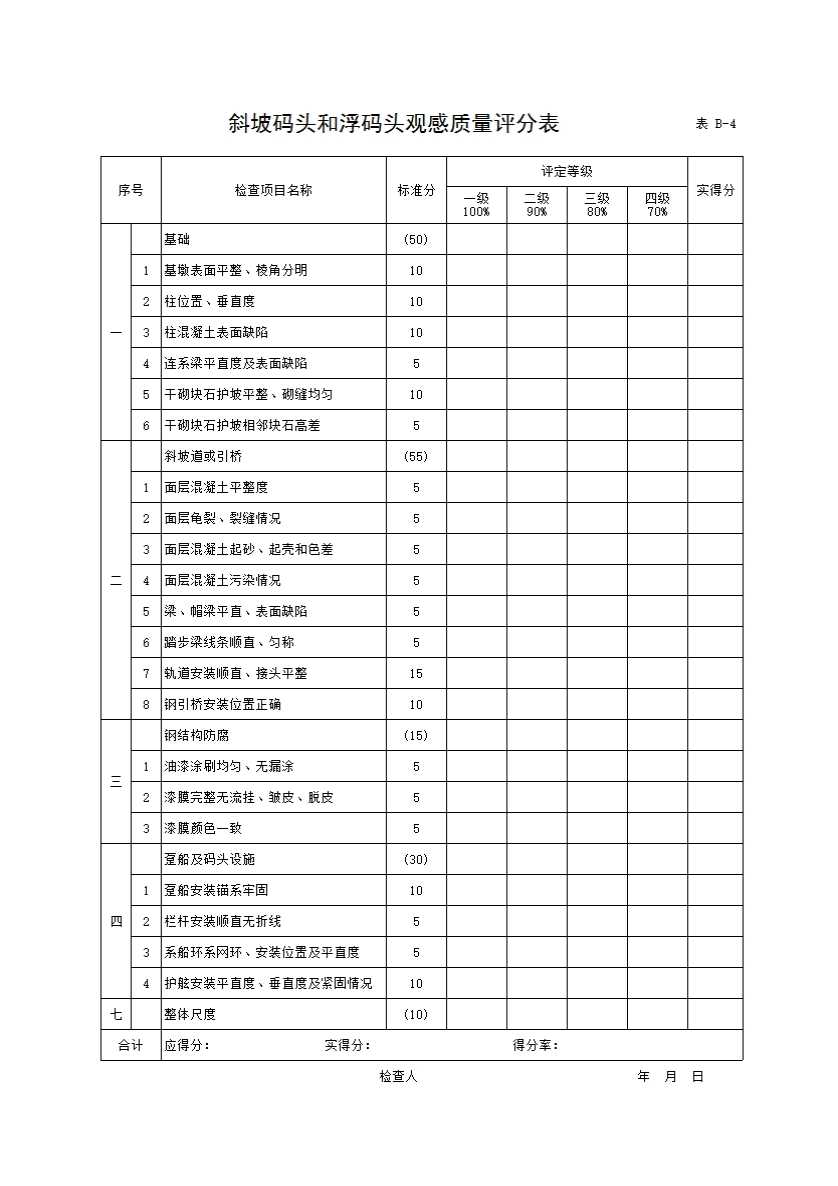 表格名称:表B-4 斜坡码头和浮码头观感质量评分表